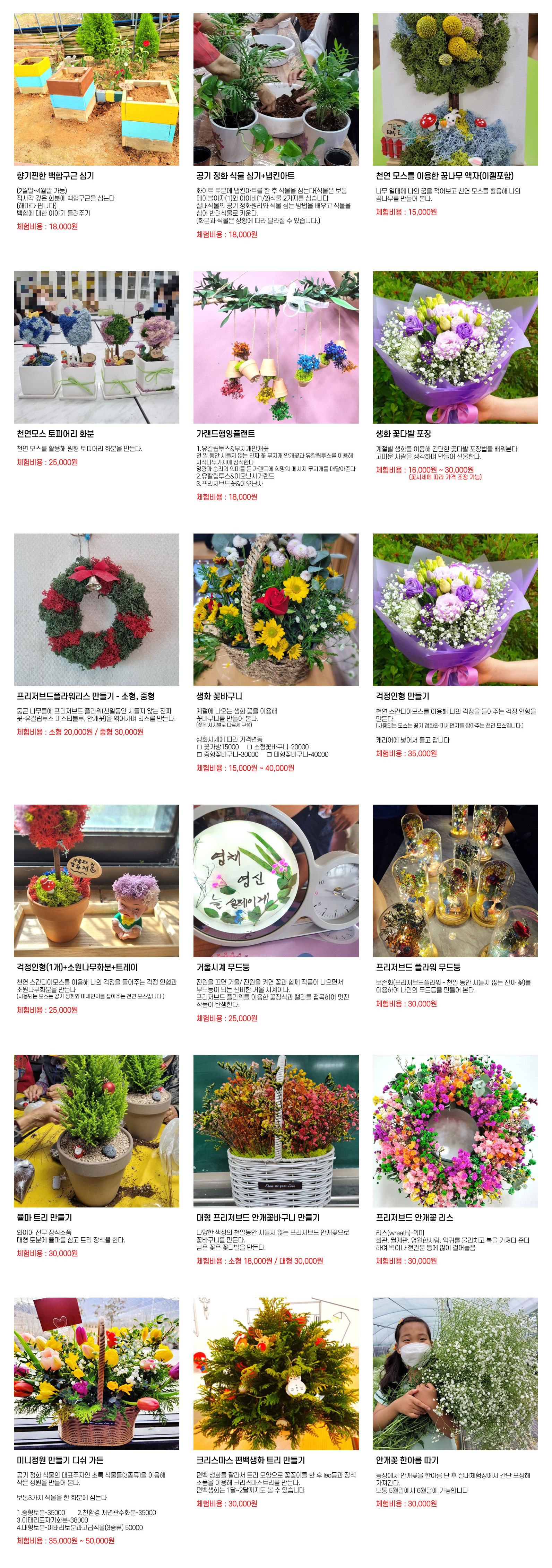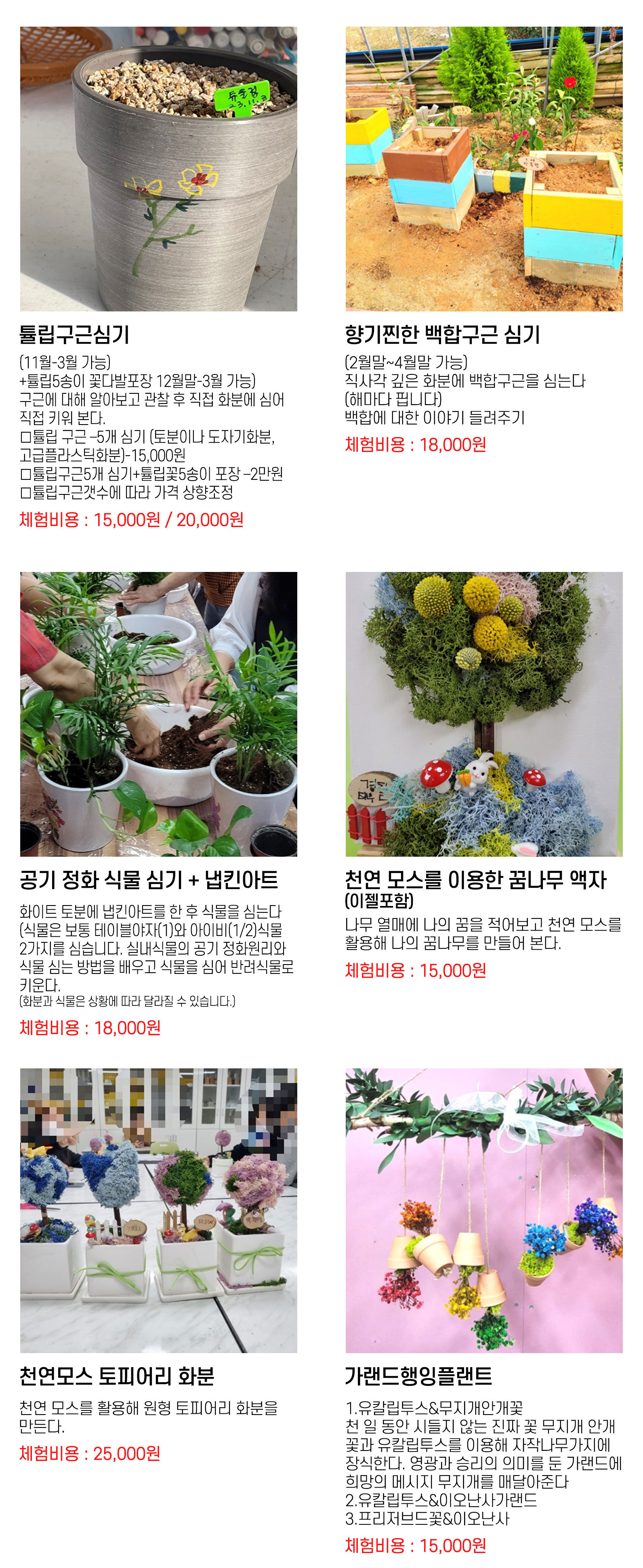 예를들어 5월 어버이날 카네이션꽃바구니만들기, 성탄절 트리/바질-파종 육묘 심기 수확후 바질페스토 만들기/토마토 오이 심기- 지주대세우기 수확후 카나페 오이피클만들기/허브식물심기 -포푸리 워터추출 방향제만들기 모히또칵테일만들기/참외 수박화채/우리들의 정원만들기-직접디자인하고 심기 꽃압화 안개꽃칼라 물올리기/김장채소-파종 심기 수확 김장하기/꽃모종심기 가꾸고 수확후 로컬푸드출하 소득창출경험/미션게임과 놀이등을 통해 자연에서 놀고 자연과 맘껏 소통함으로 생명의 소중함을 깨닫고 스스로 치유를 경험하면서 자신감 자존감을 갖도록 합니다